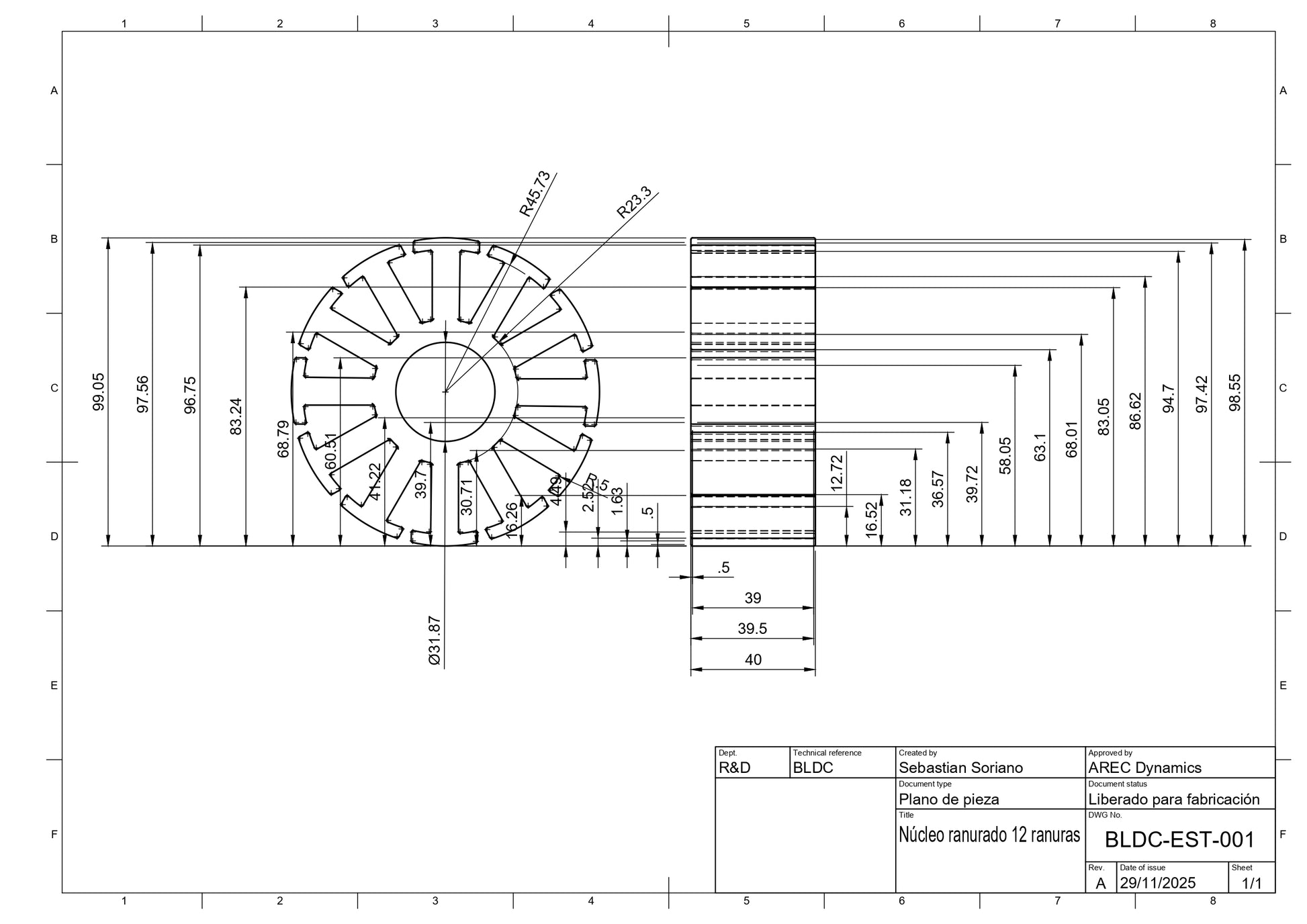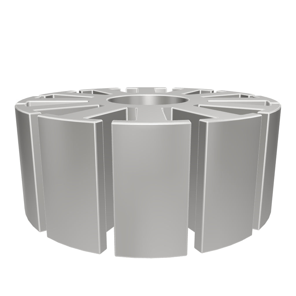 Estator de 12 ranuras impreso en 3D, diseñado por AREC Dynamics para prototipado rápido y aprendizaje de motores brushless. Su geometría ranurada permite visualizar con claridad la distribución de los dientes y el espacio disponible para el bobinado, ideal para validar diseños antes de fabricar el estator definitivo en chapa magnética.